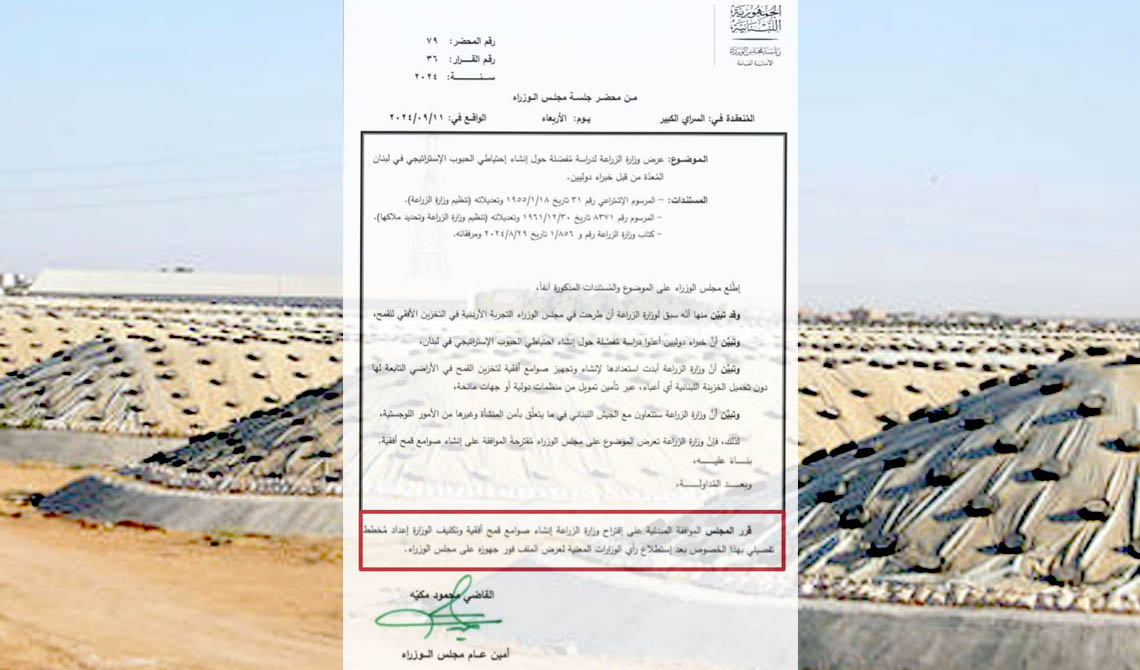مجلس الوزراء قرر الموافقة على اقتراح وزارة الزراعة، إنشاء صوامع قمح أفقية ||مما سيمكن لبنان من إمتلاك إحتياطي إستراتيجي للحبوب||.