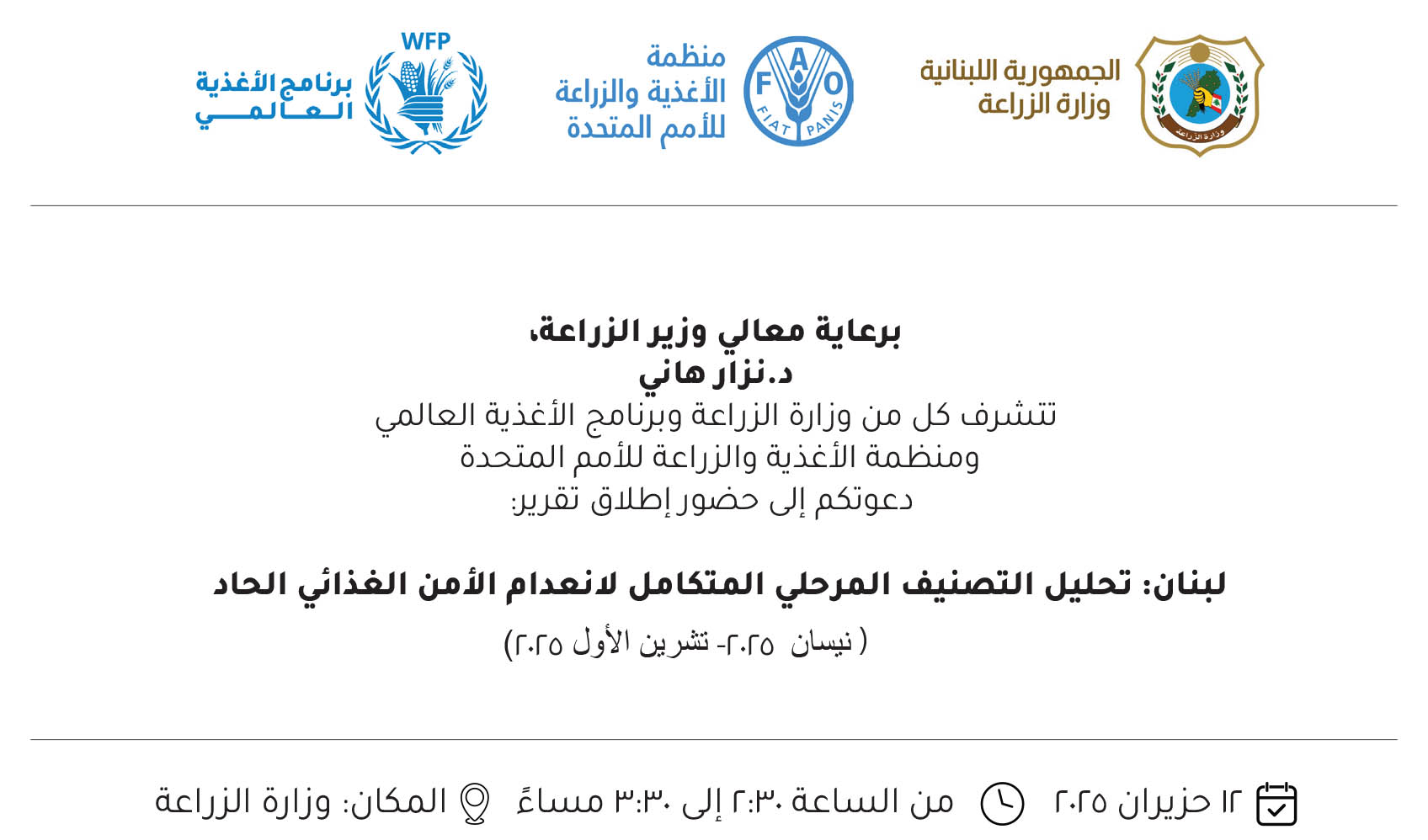 برعاية معالي وزير الزراعة د. نزار هاني، تتشرف كل من وزارة الزراعة وبرنامج الأغذية العالمي ومنظمة الأغذية والزراعة للأمم المتحدة دعوتكم إلى حضور إطلاق تقرير: