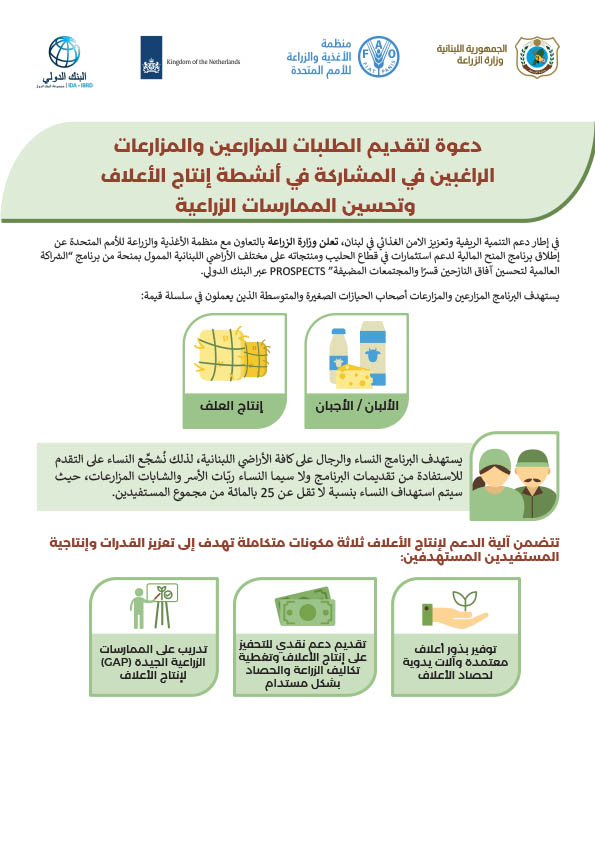 تعلن وزارة الزراعة اللبنانية، بالتعاون مع منظمة الأغذية والزراعة للأمم المتحدة (الفاو)، وبتمويل بمنحة من برنامج "الشراكة العالمية لتحسين آفاق النازحين قسرًا والمجتمعات المضيفة" PROSPECTS عبر البنك الدولي عن فتح باب تقديم الطلبات للمزارعين والمزارعات الراغبين/ات في تحسين الممارسات الزراعية والمشاركة في أنشطة إنتاج الأعلاف.