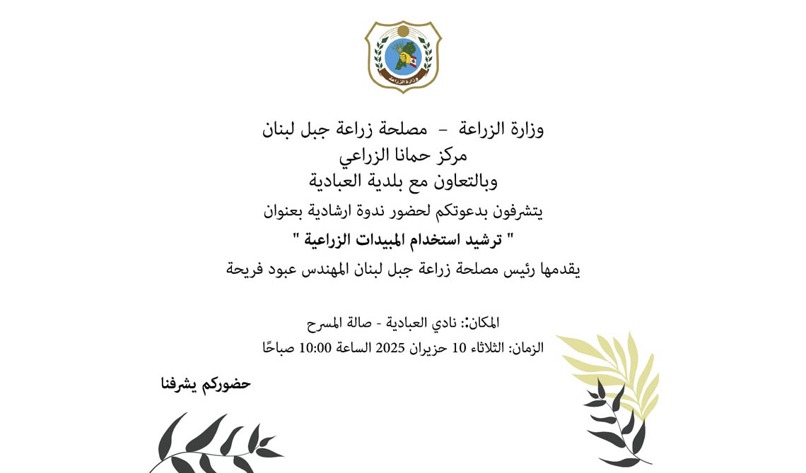 دعوة من وزارة الزراعة – مصلحة زراعة جبل لبنان – مركز حمانا الزراعي بالتعاون مع بلدية العبادية لحضور ندوة ارشادية بعنوان: "ترشيد استخدام المبيدات الزراعية" يقدمها رئيس مصلحة زراعة جبل لبنان المهندس عبود فريحة. يوم الثلاثاء 10 حزيران المقبل في صالة المسرح – نادي العبادية الساعة العاشرة صباحاً.