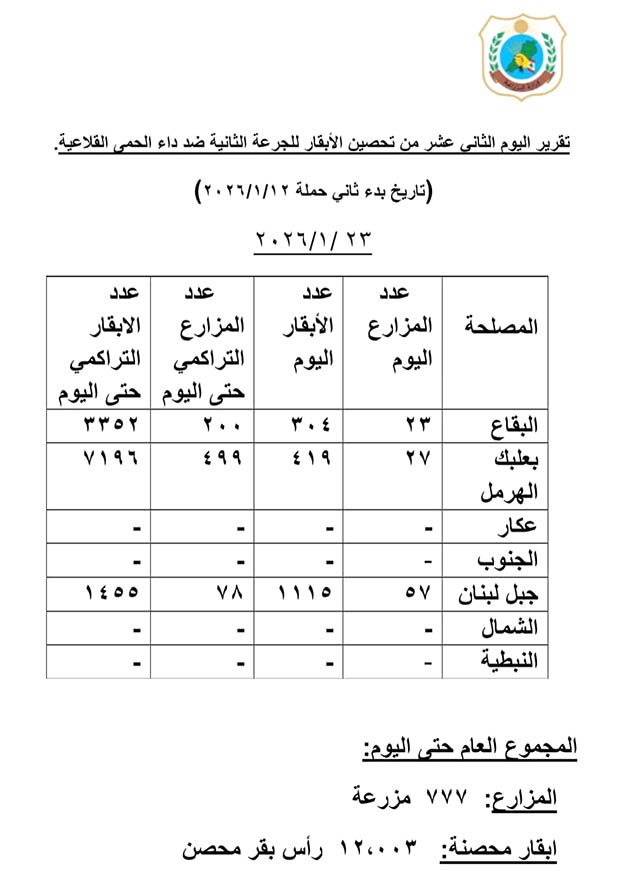 وقد جرى الانتهاء من إعطاء الجرعة الأولى لجميع قطعان الأبقار المستهدفة على امتداد الأراضي اللبنانية، فيما بدأت حاليًا عملية إعطاء الجرعة الثانية، بهدف تعزيز المناعة وتأمين الحماية الكاملة للقطعان. كما تشهد الحملة توسّعًا تدريجيًا لتشمل أيضًا الأغنام والماعز، ضمن مقاربة شاملة تستهدف مختلف مكوّنات الثروة الحيوانية.