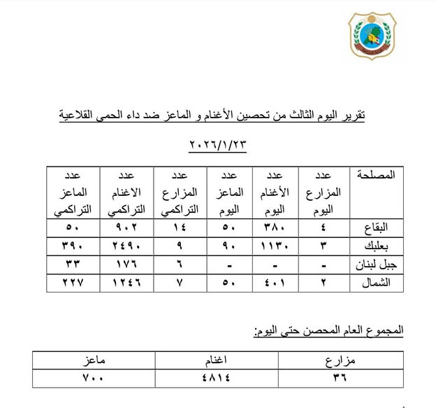 ويواصل فريق وزارة الزراعة، ولا سيما فرق مديرية الثروة الحيوانية والأطباء البيطريين الميدانيين، تنفيذ عمليات التحصين والمتابعة اليومية في القرى والبلدات والمناطق الريفية، وفق خطة عمل منظمة وميدانية تضمن الوصول إلى أكبر عدد ممكن من المربين والقطعان، وتطبيق أعلى المعايير الصحية والبيطرية.