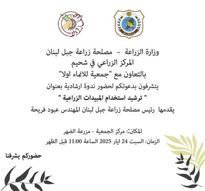 22 أيار 2025 يقدم رئيس مصلحة زراعة جبل لبنان  المزيد... 22 أيار 2025 هاني: نعمل وفق رؤية تكاملية متماسكة تعيد  المزيد... 22 أيار 2025 تقرير اخباري في النشرة الاخبارية  المزيد... 21 أيار 2025 أعلنت وزارة الزراعة عن انطلاق  المزيد... 21 أيار 2025 المزيد... 20 أيار 2025 بمناسبة المزيد... 20 أيار 2025 في حلقة خاصة على تلفزيون لبنان، سلطت المهندسة كارلا  المزيد... 19 أيار 2025 المزيد... 19 أيار 2025 جعيتا، الأربعاء  المزيد... عرض النتائج 621-630 (من 2384) |< < 59 - 60 - 61 - 62 - 63 - 64 - 65 - 66 - 67 - 68 > >|