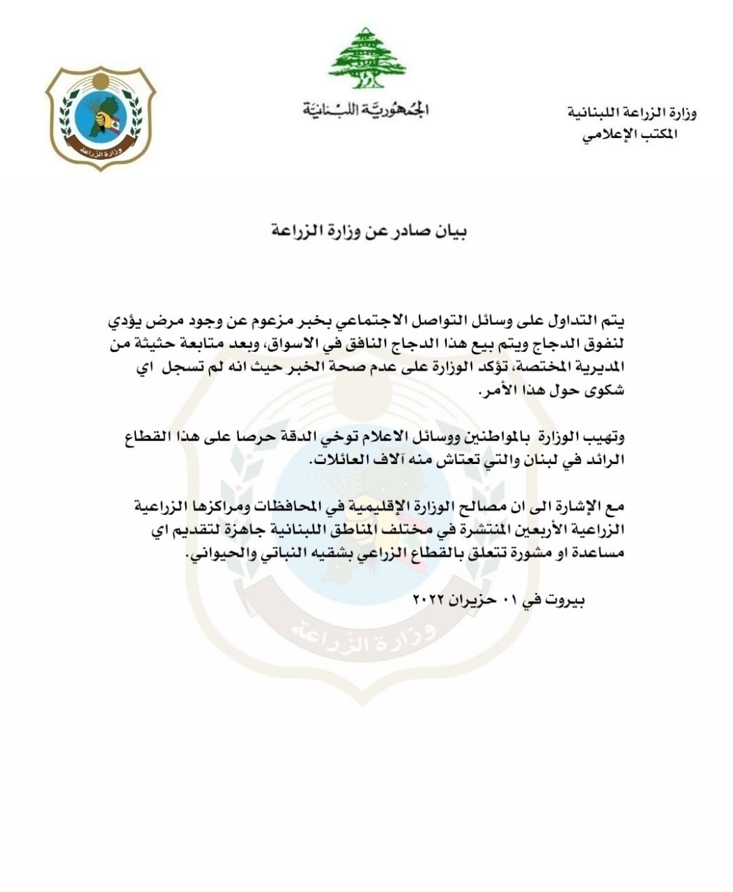بيان صادر عن وزارة الزراعة: حول اشاعة وجود مرض يؤدي الى نفوق الدجاج