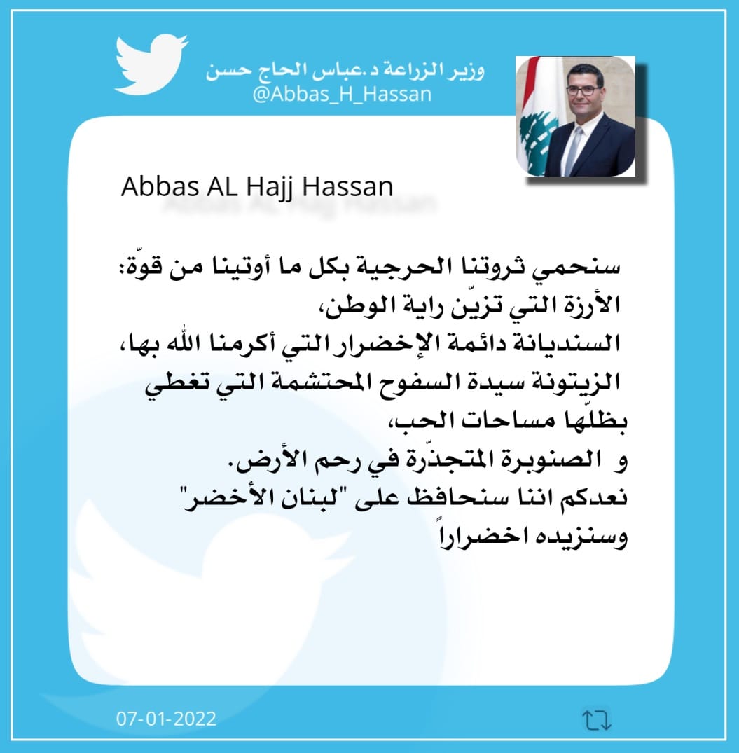 غرد وزير الزراعة الدكتور عباس الحاج حسن على حسابه على تويتر: