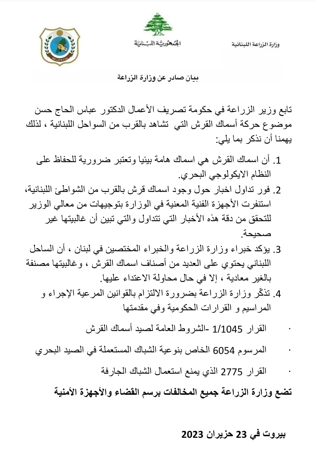 23 حزيران 2023 بيان صادر عن وزارة الزراعة حول حركة أسماك القرش في السواحل اللبنانية بيان صادر عن وزارة الزراعة حول حركة أسماك القرش في السواحل اللبنانية #وزير_الزراعة #عباس_الحاج_حسن