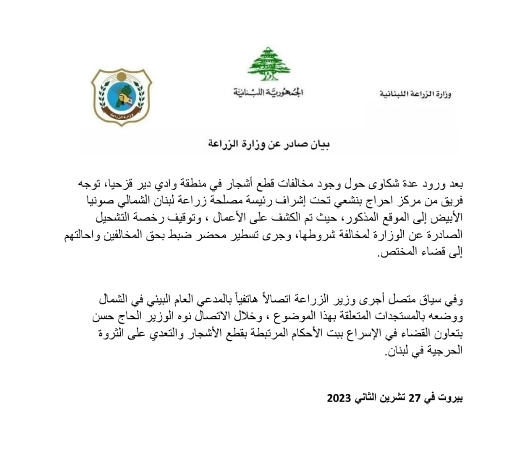 بعد ورود عدة شكاوى حول وجود مخالفات قطع أشجار في منطقة وادي دير قزحيا، توجه فريق من مركز احراج بنشعي تحت إشراف رئيسة مصلحة زراعة لبنان الشمالي صونيا الأبيض إلى الموقع المذكور، حيث تم الكشف على الأعمال، وتوقيف رخصة التشحيل الصادرة عن الوزارة لمخالفة شروطها، وجرى تسطير محضر ضبط بحق المخالفين واحالتهم إلى قضاء المختص.