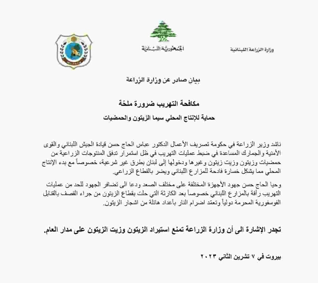 بيان صادر عن وزارة الزراعة: مكافحة التهريب ضرورة ملحّة حمايةً للإنتاج المحلي لاسيما الزيتون والحمضيا