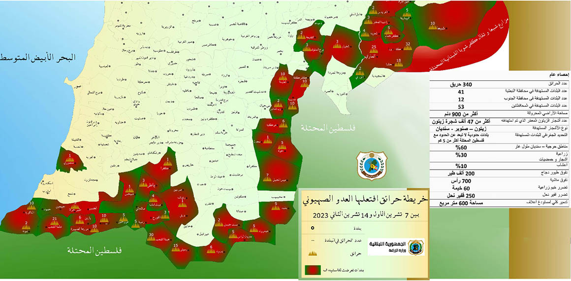 إحصاءات حول الاعتداءات التي افتعلها العدو الإسرائيلي على الأراضي اللبنانية والتي أدت إلى نشوب حرائق، منذ تاريخ  07 تشرين الأول 2023.