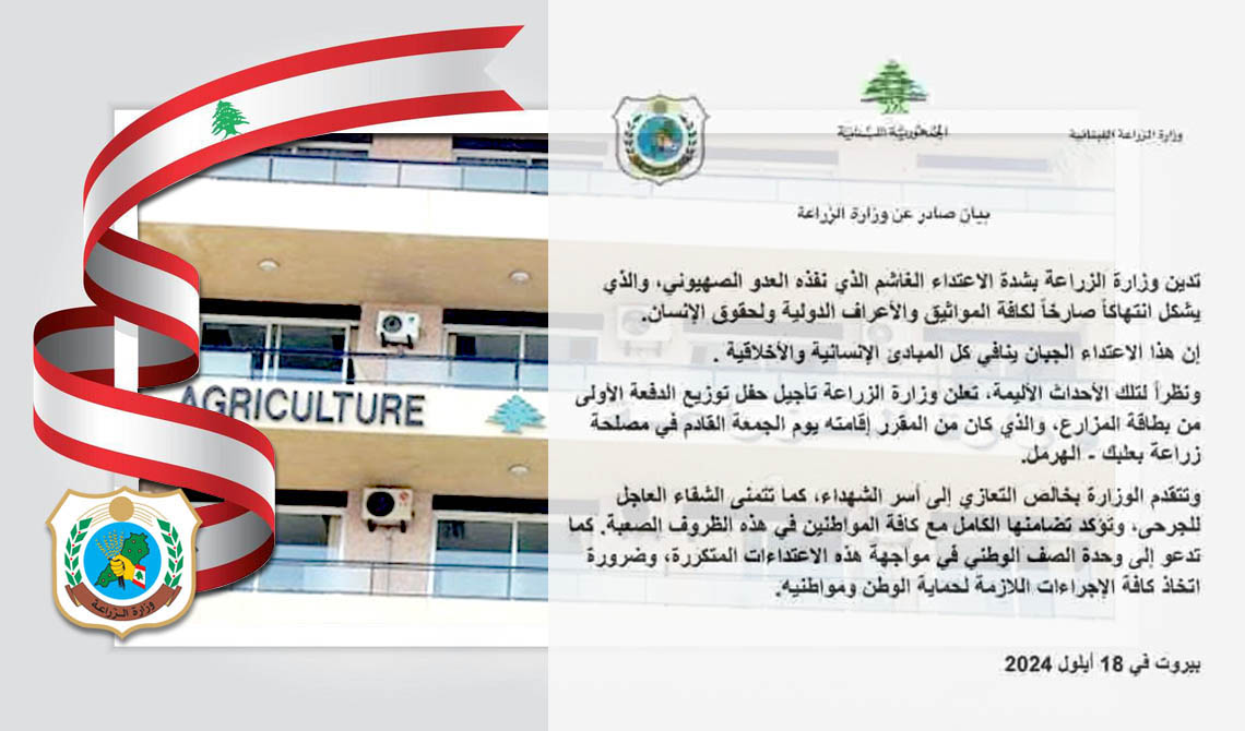ونظراً لتلك الأحداث الأليمة، تعلن وزارة الزراعة تأجيل حفل توزيع الدفعة الأولى من بطاقة المزارع، والذي كان من المقرر إقامته يوم الجمعة المقبل في مصلحة زراعة بعلبك-الهرمل.