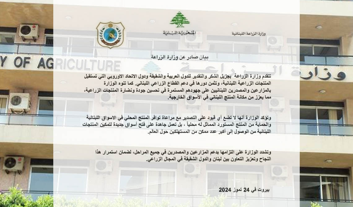وتشدد الوزارة على التزامها بدعم المزارعين والمصدرين في جميع المراحل، لضمان استمرار هذا النجاح وتعزيز التعاون بين لبنان والدول الشقيقة في المجال الزراعي.