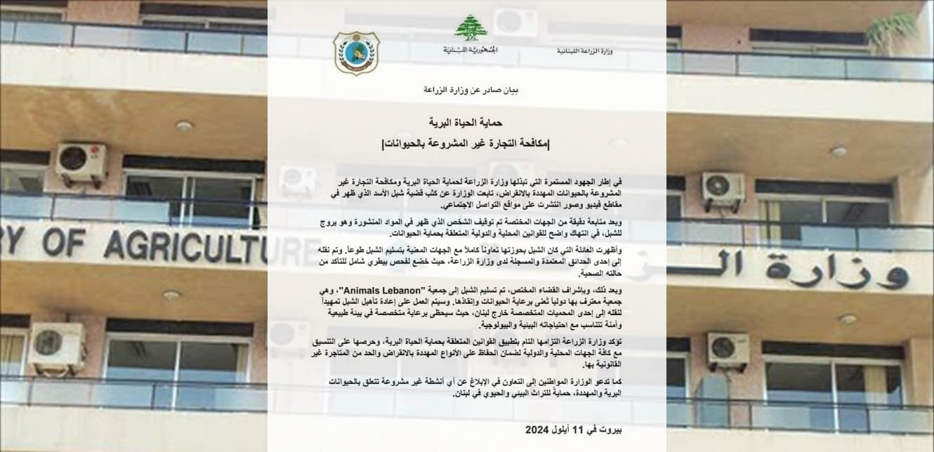 كما تدعو الوزارة المواطنين، إلى التعاون في الإبلاغ عن أي أنشطة غير مشروعة، تتعلق بالحيوانات البرية والمهددة، حمايةً للتراث البيئي والحيوي في لبنان.