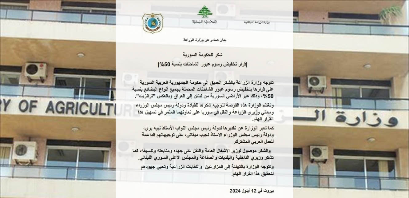 تتوجه وزارة الزراعة بالشكر العميق إلى حكومة الجمهورية العربية السورية، على قرارها بتخفيض رسوم عبور الشاحنات المحملة بجميع أنواع البضائع بنسبة 50%، وذلك عبر الأراضي السورية من لبنان إلى العراق وبالعكس "ترانزيت".