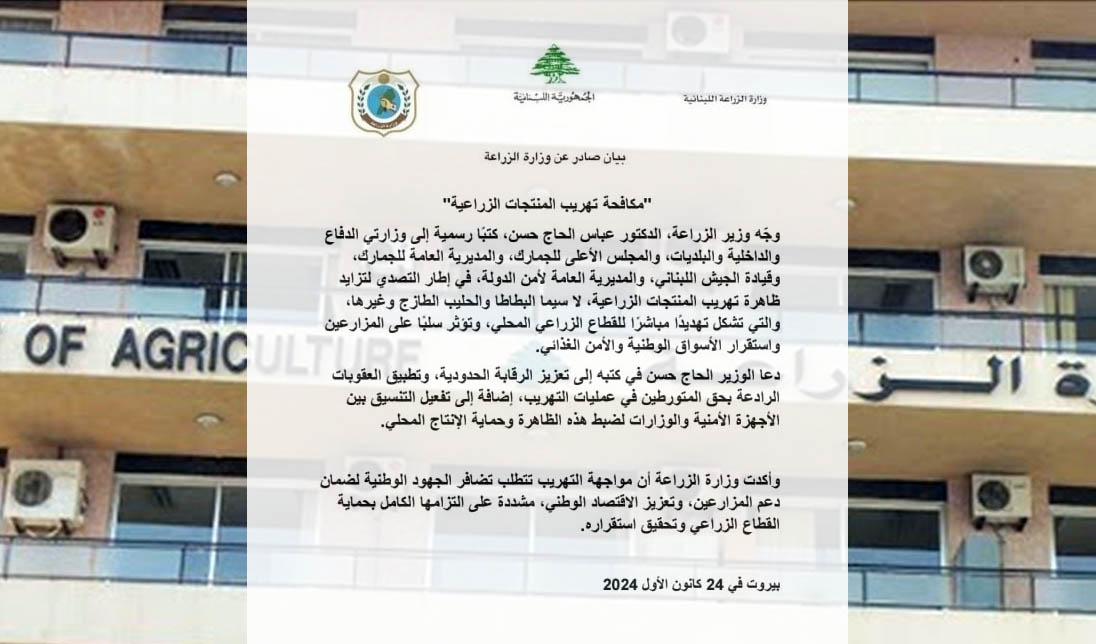 وجّه وزير الزراعة في حكومة تصريف الأعمال الدكتور عباس الحاج حسن، كتباً رسمية إلى وزارتي الدفاع والداخلية والبلديات، والمجلس الأعلى للجمارك، والمديرية العامة للجمارك، وقيادة الجيش اللبناني، والمديرية العامة لأمن الدولة، في إطار التصدي لتزايد ظاهرة تهريب المنتجات الزراعية، لاسيما البطاطا والحليب الطازج وغيرها، والتي تشكل تهديداً مباشراً للقطاع الزراعي المحلي، وتؤثر سلباً على المزارعين واستقرار الأسواق الوطنية والأمن الغذائي.