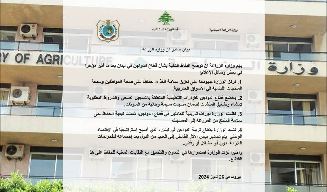 4. تشيد الوزارة بقطاع تربية الدواجن في لبنان، الذي أصبح قطاعاً استراتيجياً في الاقتصاد الوطني. يتم تصدير بيض الأكل الفائض إلى العديد من الدول بعد إخضاعه للفحوصات اللازمة، دون أي مشاكل أو رفض.