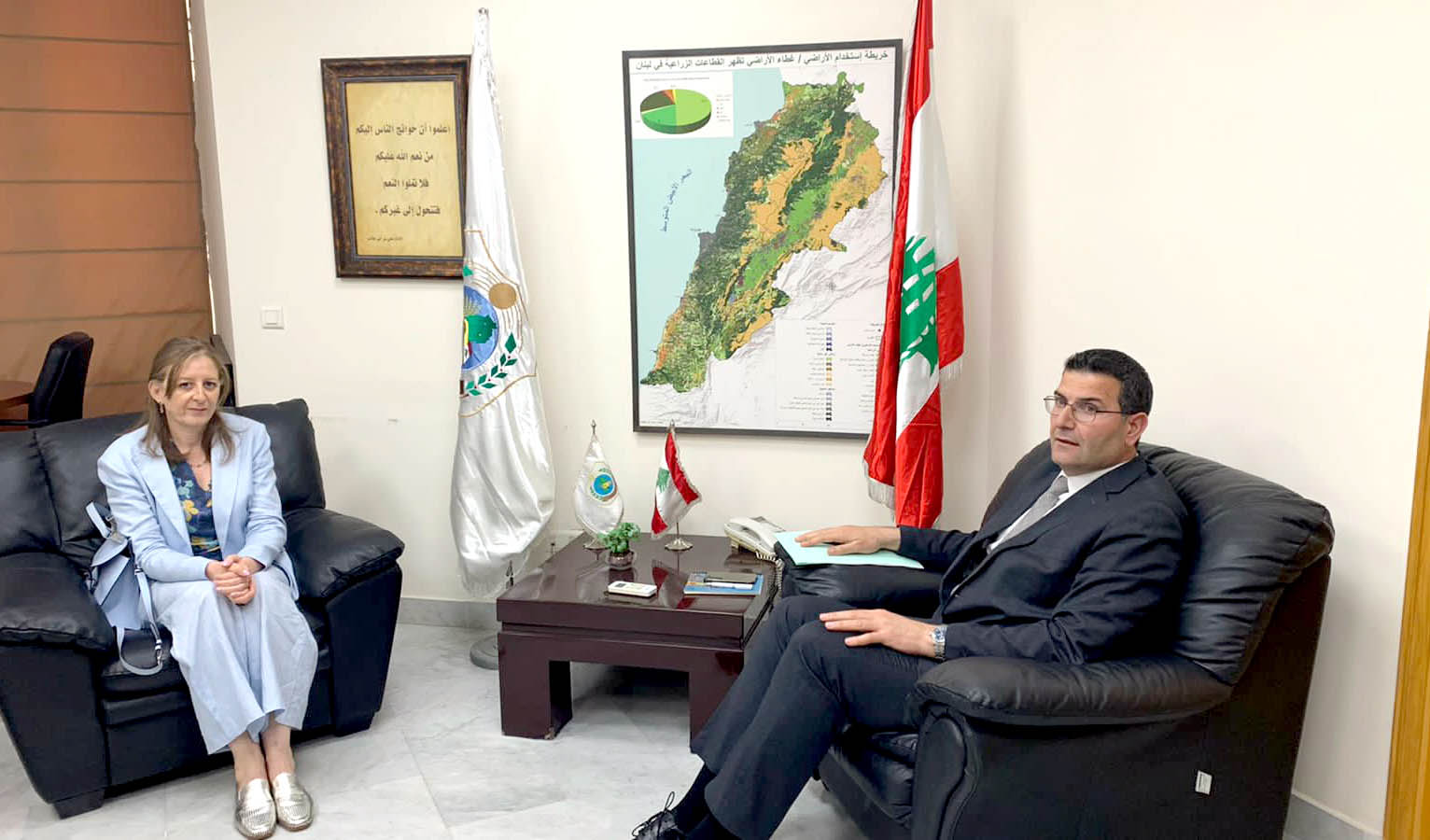 استقبل وزير الزراعة في حكومة تصريف الاعمال الدكتور عباس الحاج حسن في مكتبه في الوزارة ممثلة منظمة الأغذية والزراعة للأمم المتحدة (الفاو) في لبنان السيدة نورة اورابح حداد، حيث تمت متابعة المشاريع التي تنفذ حالياً بالشراكة بين الوزارة والمنظمة، بالاضافة إلى مشاريع أخرى منوي اطلاقها بهبات من الدول المانحة.