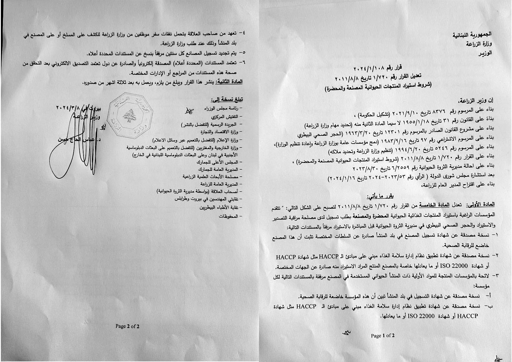 اصدر وزير الزراعة في حكومة تصريف الاعمال عباس الحاج حسن قراراً حدد بموجبه شروط استيراد المنتجات الحيوانية المصنعة والمحضرة إلى لبنان. وتضمن القرار متطلبات تسجيل المصانع والمؤسسات المنتجة، بما في ذلك الشهادات المطلوبة للرقابة الصحية وإدارة سلامة الغذاء. واشترط القرار تجديد تسجيل المصانع كل سنتين. ويهدف القرار إلى تنظيم عملية الاستيراد وضمان جودة المنتجات المستوردة المصنعة والمحضرة حماية للمستهلك اللبناني. وقد تضمن ما يلي: