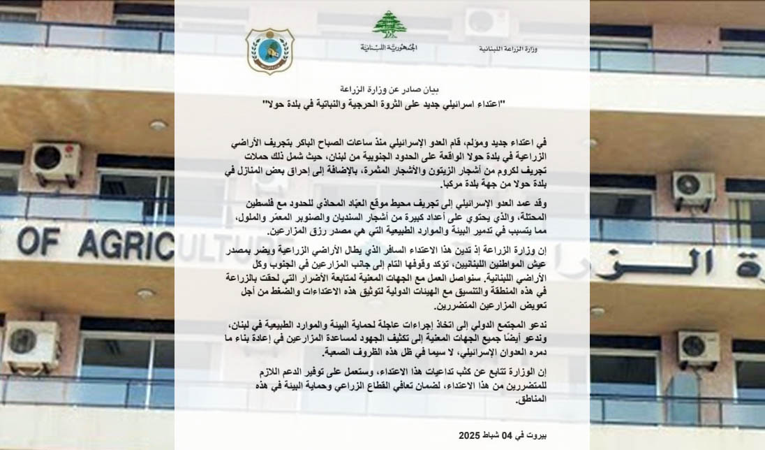 إن وزارة الزراعة إذ تدين هذا الاعتداء السافر الذي يطال الأراضي الزراعية ويضر بمصدر عيش المواطنين اللبنانيين، تؤكد وقوفها التام إلى جانب المزارعين في الجنوب وكل الأراضي اللبنانية. سنواصل العمل مع الجهات المعنية لمتابعة الأضرار التي لحقت بالزراعة في هذه المنطقة والتنسيق مع الهيئات الدولية لتوثيق هذه الاعتداءات والضغط من أجل تعويض المزارعين المتضررين.