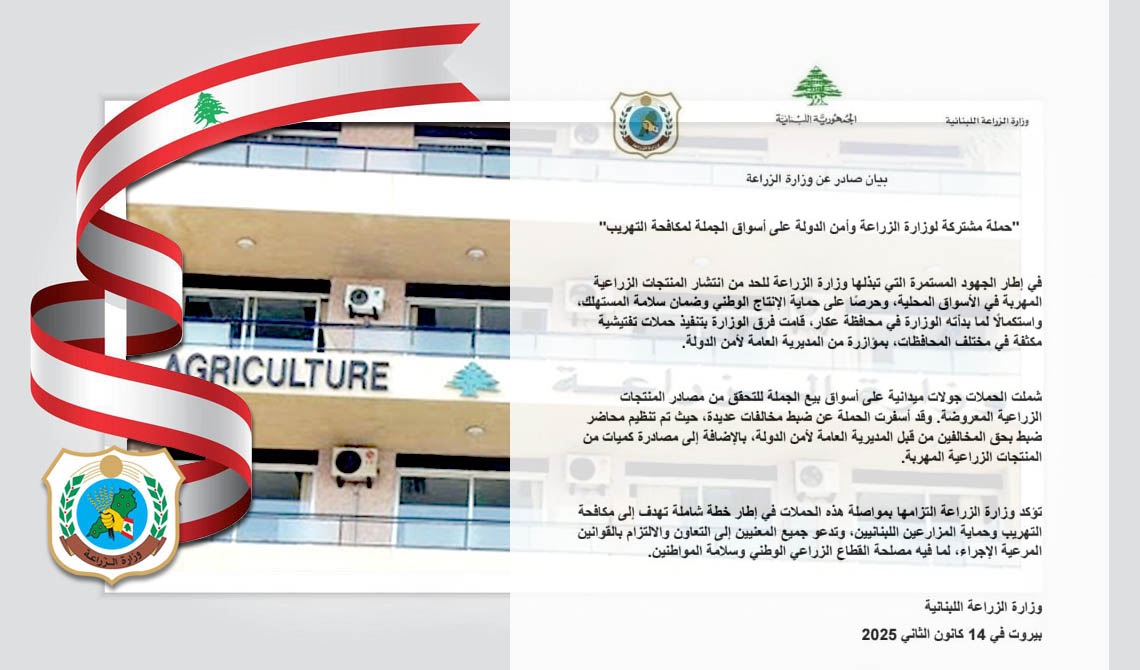 14 كانون الثاني 2025 في إطار الجهود المستمرة التي تبذلها وزارة الزراعة للحد من انتشار المنتوجات الزراعية المهربة في الأسواق المحلية، وحرصاً على حماية الإنتاج الوطني وضمان سلامة المستهلك، واستكمالاً لما بدأته الوزارة في محافظة عكار، قامت فرق الوزارة بتنفيذ حملات تفتيشية مكثفة في مختلف المحافظات، بمؤازرة من المديرية العامة لأمن الدولة. شملت الحملات جولات ميدانية على أسواق بيع الجملة للتحقق من مصادر المنتوجات الزراعية المعروضة. وأسفرت الحملة عن ضبط مخالفات عديدة، حيث تم تنظيم محاضر ضبط بحق المخالفين من قبل المديرية العامة لأمن الدولة، بالإضافة إلى مصادرة كميات من المنتوجات الزراعية المهربة. تؤكد وزارة الزراعة التزامها بمواصلة هذه الحملات في إطار خطة شاملة تهدف إلى مكافحة التهريب وحماية المزارعين اللبنانيين، وتدعو جميع المعنيين إلى التعاون والالتزام بالقوانين المرعية الإجراء، لما فيه مصلحة القطاع الزراعي الوطني وسلامة المواطنين. بيروت في 14 كانون الثاني 2025. #وزير_الزراعة #عباس_الحاج_حسن