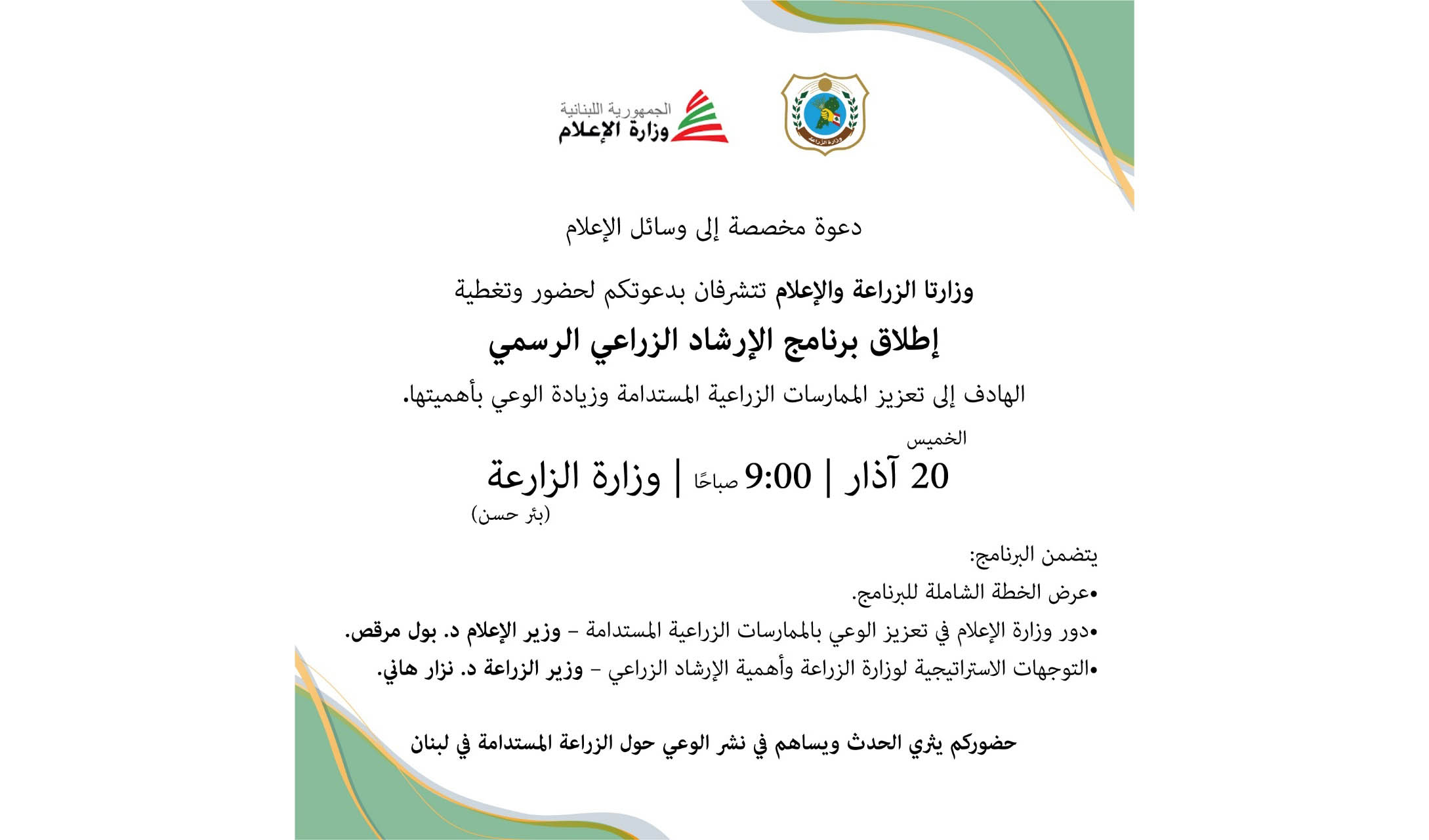 ترقبوا كلمتي معالي وزيري: الإعلام والزراعة خلال مؤتمر: "إطلاق برنامج الارشاد الزراعي الرسمي " الهادف الى تعزير الممارسات الزراعية المستدامة وزيادة الوعي بأهميتها .من وزارة الزراعة في بئر حسن …. مباشر