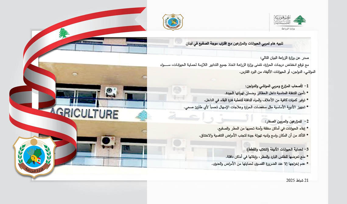 مع توقع انخفاض درجات الحرارة، تتمنى وزارة الزراعة اتخاذ جميع التدابير اللازمة لحماية الحيوانات، سواء المواشي، الدواجن، أو الحيوانات الأليفة، من البرد القارس.