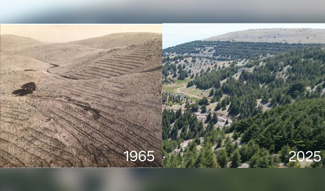 منذ ٦٠ عامًا تقريبا ساهمت وزارة الزراعة عبر المشروع الأخضر في غرس حوالي مليون شجرة أرز في أعالي جبل الباروك. الأمر الذي حول الأرض الجرداء كما يبدو في الصورة التي تعود للعام ١٩٦٥ إلى غابة أرز خضراء والتي تظهرها الصورة الثانية التي التقطت في العام ٢٠٢٥. لتكون جزءًا أساسيًا من محمية أرز الشوف التي تضم ٣٠% من غابات الأرز المتبقية في لبنان.