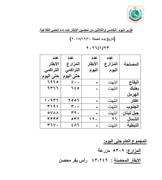 الحمى القلاعية بنجاح واسع في مختلف المناطق اللبنانية، بإشراف ومتابعة مباشرة من وزارة الزراعة، في إطار الجهود الوقائية الهادفة إلى حماية الثروة الحيوانية وتعزيز الأمن الغذائي الوطني