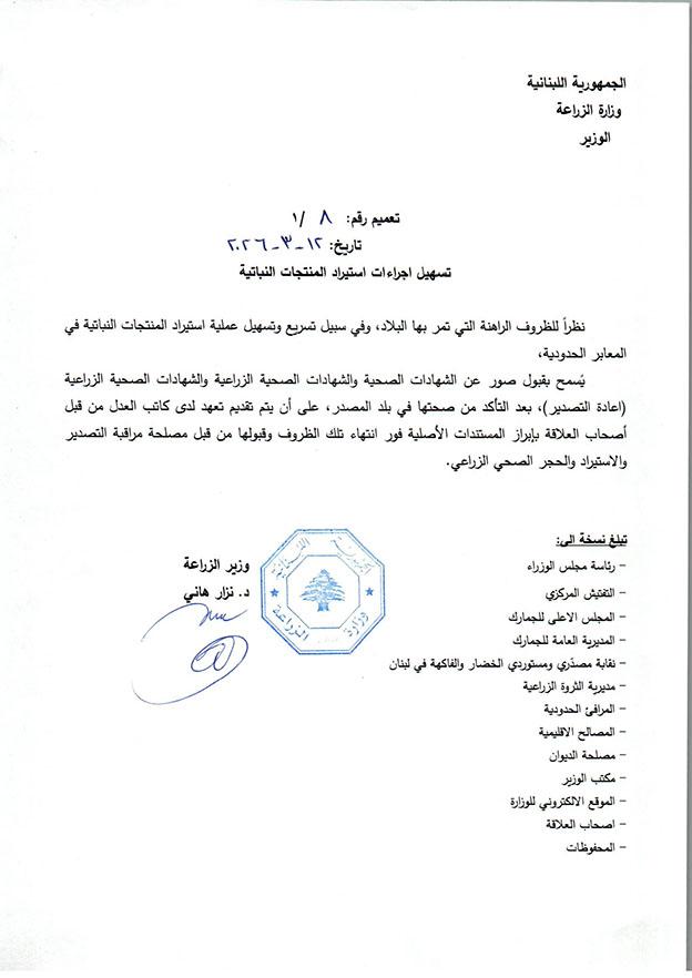 – في ظل الظروف الراهنة التي تمر بها البلاد وما تفرضه من تحديات على حركة الاستيراد والتبادل التجاري عبر المعابر الحدودية، أصدرت وزارة الزراعة تعميماً يقضي باتخاذ تدابير استثنائية موقتة تهدف إلى تسريع وتسهيل إجراءات استيراد المنتجات النباتية، بما يضمن استمرار انسيابية دخول السلع الزراعية إلى الأسواق اللبنانية وعدم تعرّض سلاسل الإمداد لأي عوائق إدارية