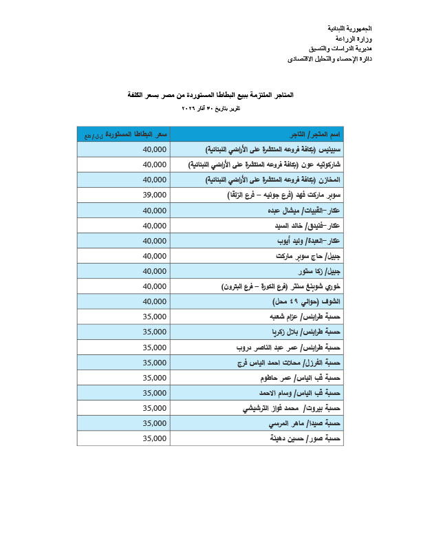 بيروت – أعلنت وزارة الزراعة، بالتعاون مع نقابة مزارعي البطاطا في البقاع، لائحة المتاجر ونقاط البيع الملتزمة ببيع البطاطا بالسعر المخفّض، وذلك في إطار المبادرة الهادفة إلى دعم الأمن الغذائي وتخفيف الأعباء المعيشية عن المواطنين.