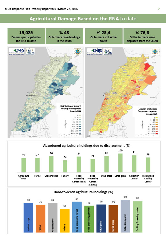 Amid escalating tensions and rapidly evolving challenges, this first weekly report reveals a deeply alarming reality facing Lebanon’s agricultural sector. Extensive areas of farmland have been damaged, while farmers and livestock resources have sustained severe losses—directly threatening the continuity of production and placing national food security under significant strain.