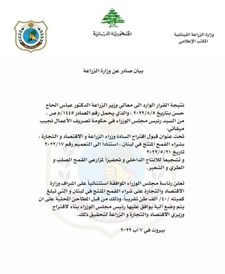 11 آب 2022 تعلن وزارة الزراعة عن اصدار نتائج الامتحانات  المزيد... 11 آب 2022 استقبل وزير الزراعة في حكومة تصريف الاعمال الدكتور عباس الحاج حسن  المزيد... 11 آب 2022 استقبل وزير الزراعة في حكومة تصريف الاعمال الدكتور  المزيد... 07 آب 2022 #وزير_الزراعة #عباس_الحاج_حسن 05 آب 2022 المزيد... 05 آب 2022 ترأس رئيس الحكومة نجيب ميقاتي  المزيد... 30 تموز 2022 تأكيداً لأواصر الأخوة، وفي إطار تفعيل التعاون في  المزيد... عرض النتائج 1311-1320 (من 2107) |< < 128 - 129 - 130 - 131 - 132 - 133 - 134 - 135 - 136 - 137 > >|