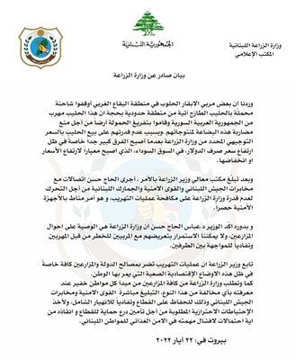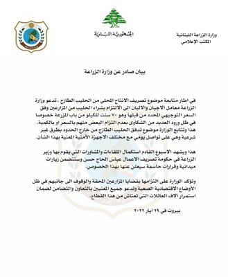 29 أيار 2022 المزيد... 28 أيار 2022 #وزير_الزراعة #عباس_الحاج_حسن 23 أيار 2022 استقبل وزير الزراعة الدكتور عباس الحاج حسن  المزيد... 22 أيار 2022 بيان صادر عن وزارة الزراعة: لتأمين درع حماية للقطاع الزراعي وانقاذ  المزيد... 19 أيار 2022 استقبل معالي وزير الزراعة الدكتور عباس الحاج حسن  المزيد... 18 أيار 2022 زار وزير الزراعة الدكتور عباس الحاج حسن يرافقه  المزيد... عرض النتائج 1361-1370 (من 2107) |< < 133 - 134 - 135 - 136 - 137 - 138 - 139 - 140 - 141 - 142 > >|