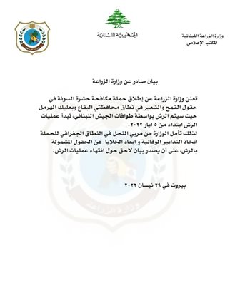 22 نيسان 2022 أكد وزير الزراعة في مقابلة خاصة لموقع "  المزيد... 21 نيسان 2022 افتتحت النقابة اللبنانية للدواجن مقراً جديداً لها في منطقة ضبيه، في  المزيد... 20 نيسان 2022 استقبل وزير الزراعة الدكتور عباس الحاج حسن وفدا  المزيد... 19 نيسان 2022 نؤمن بالشراكة الوطنية الحقيقه وندعو لأوسع  المزيد... 18 نيسان 2022 بيان صادر عن وزارة الزراعة: اولى الاولويات حماية المنتَج اللبناني  المزيد... 17 نيسان 2022 اعتبر وزير الزراعة د. عباس الحاج حسن أن «  المزيد... 12 نيسان 2022 أكّد وزير الزراعة د. عباس الحاج حسن، أن «  المزيد... 08 نيسان 2022 اشار وزير الزراعة عباس الحاج حسن، الى أن  المزيد... عرض النتائج 1381-1390 (من 2107) |< < 135 - 136 - 137 - 138 - 139 - 140 - 141 - 142 - 143 - 144 > >|