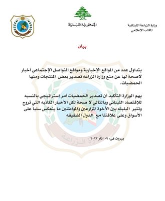 06 آذار 2022 أشار وزير الزراعة عباس الحاج الحسن الى أن "الوزارة ستعمل على منع تصدير المواد الزراعية وغيرها  المزيد...