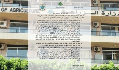 14 أيار 2024 أثير في بعض وسائل الاعلام، موضوع وجود ترسبات مبيدات على منتج  المزيد... 11 أيار 2024 وزير الزراعة في حكومة تصريف الاعمال الدكتور عباس الحاج  المزيد... 03 أيار 2024 بتوجيهات من وزير الزراعة في حكومة  المزيد... 03 أيار 2024 خلال زيارته  المزيد... 02 أيار 2024 التقى وزير الزراعة في حكومة تصريف  المزيد... 01 أيار 2024 المزيد... 01 أيار 2024 بحث وزير الزراعة اللبناني في حكومة  المزيد... 01 أيار 2024 بيان صادر عن وزارة الزراعة<  المزيد... عرض النتائج 791-800 (من 2107) |< < 76 - 77 - 78 - 79 - 80 - 81 - 82 - 83 - 84 - 85 > >|